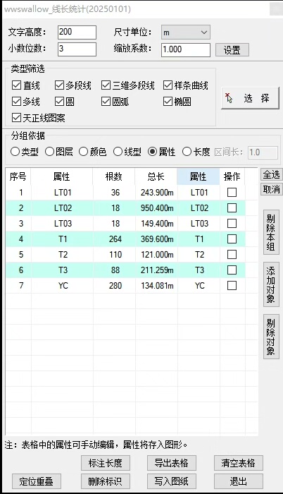 除了标准图形属性外,用户还可为线条添加自定义属性(如编号、材质、区域等),并基于这些属性进行分组和过滤,满足复杂项目的个性化统计需求,提升数据处理的灵活性与实用性。